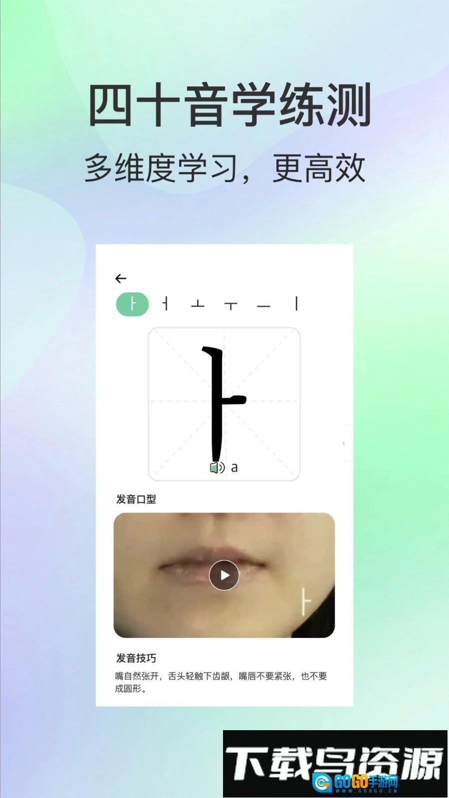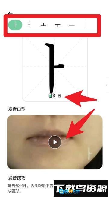 4、在单个发音学习界面,点击字母旁喇叭图标可听取发音,并观看口型视频学习正确发音技巧。