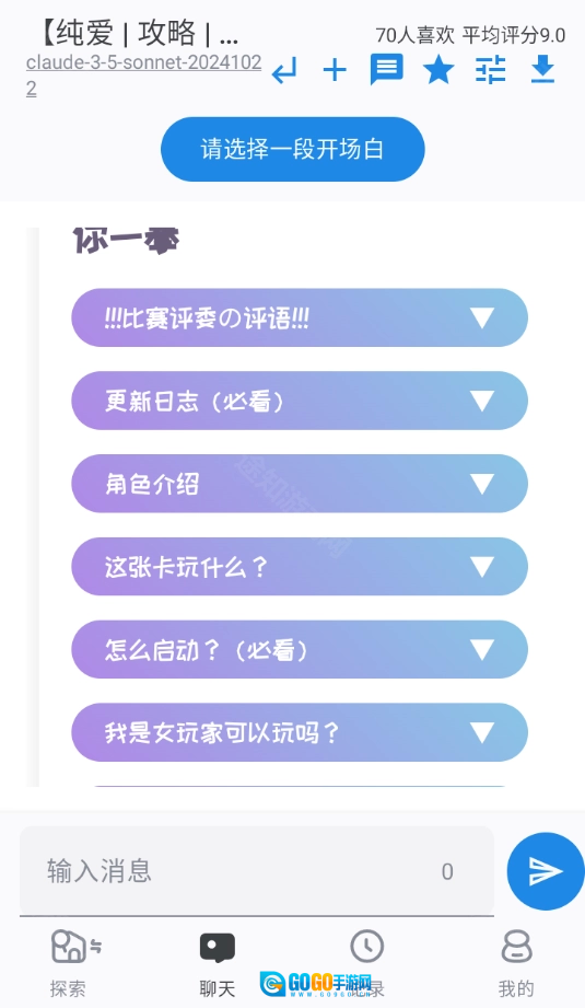 2、点击对应角色的封面图就能进入聊天界面,在这里可以查看创作者提供的说明与提示。点击【请选择一场开场白】,即可开启剧情流程。