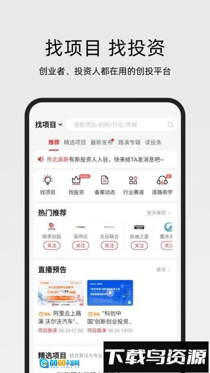1、操作流程简单直观,适合创业者与投资人使用,提供直播观看与精选项目浏览功能;
