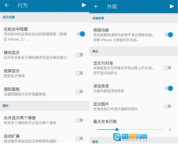 在首页的行为栏与外观栏点击进入后,会呈现出如上图所示的设置界面。我们首先需要开启锁屏显示和通知面板的开关,接着向下滑动还能找到发送回复的开关。只要设备支持相应功能,就能在弹出的灵动岛中直接回复信息。此外,还可以对灵动岛的显示时间进行设置。