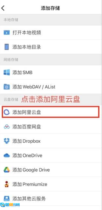 第二步:点击“添加”按钮后,再点击“添加存储”选项,系统会跳转至添加存储页面,下面以阿里云盘为例进行演示。