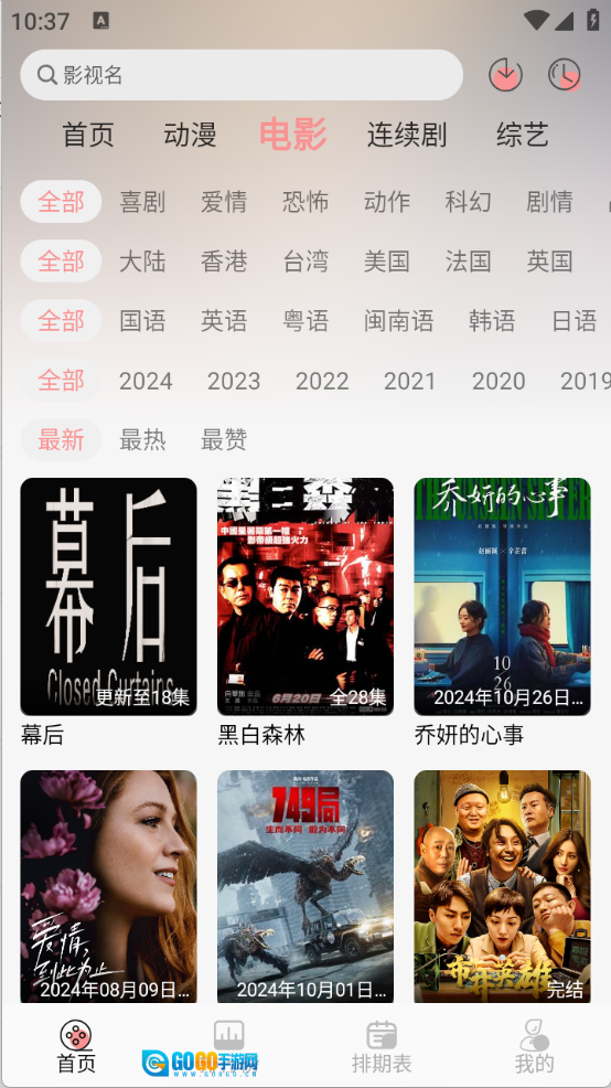 进入首页后,顶部导航栏陈列着丰富的影视分类,涵盖电视剧、电影、动漫等多种类型。