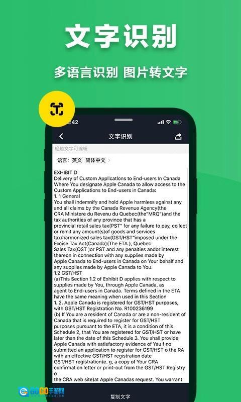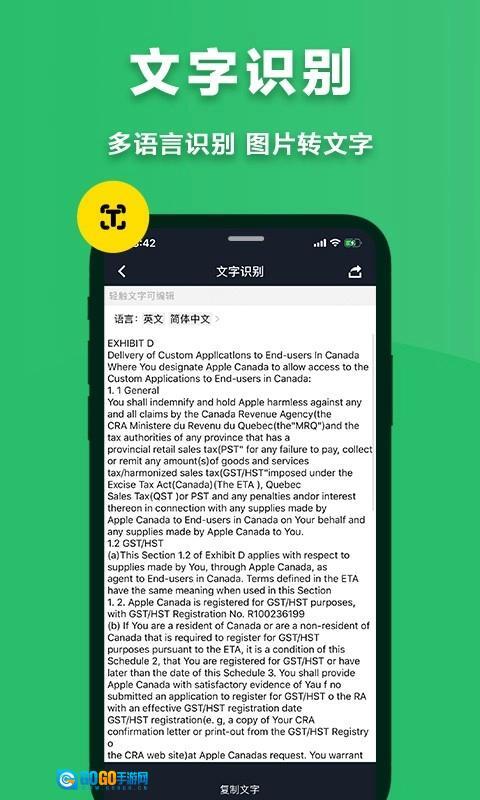 采用智能边缘识别技术,能自动校正倾斜的文档;可识别印刷体、手写体等12种字体样式;扫描结果可即时分享到微信、QQ等社交平台。