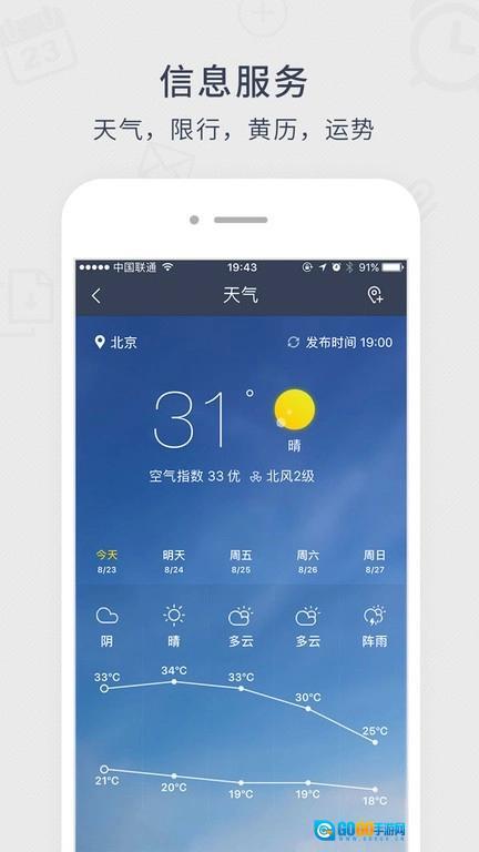 2、生活服务板块:包含车辆限行提醒、精准天气预报以及每日励志语句