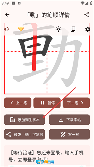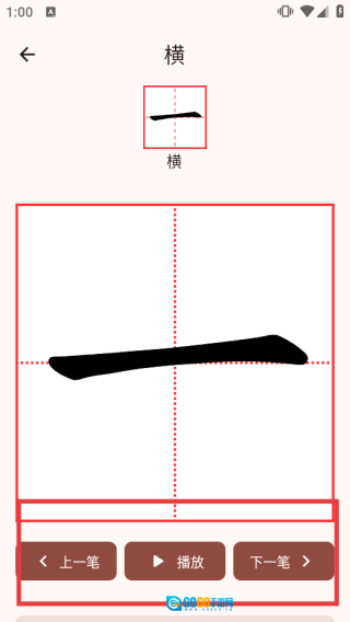 进入笔画详情页面后,点击【播放】按钮可以观看笔画动画,借助【上一笔】和【下一笔】按钮来查看笔画的先后顺序,从而学习汉字的正确书写方法。