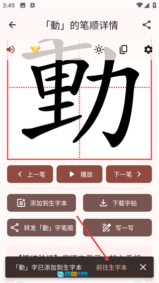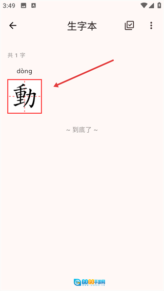 弹出“[動]字已添加到生字本”的提示后,点击提示里的“前往生字本”选项。
