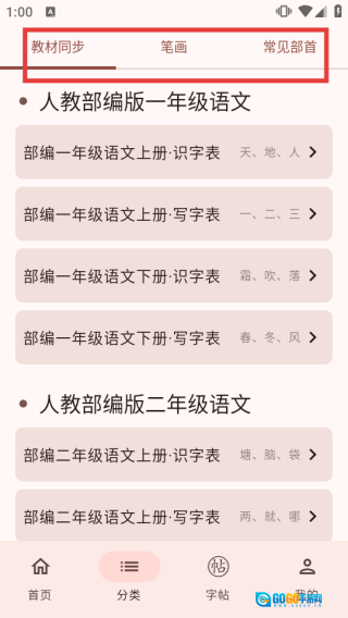 在分类页面的顶部,点击【笔画】标签,即可查看与笔画相关的教材同步内容。