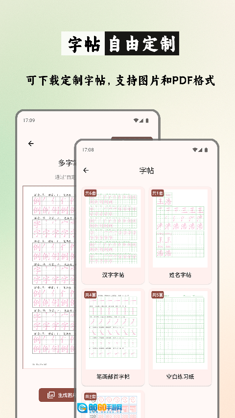 电子字帖个性定制:提供数十种字帖模板供自由搭配组合,可按需调整尺寸与颜色以生成专属练习册,支持PDF及图片格式,方便随时打印使用。