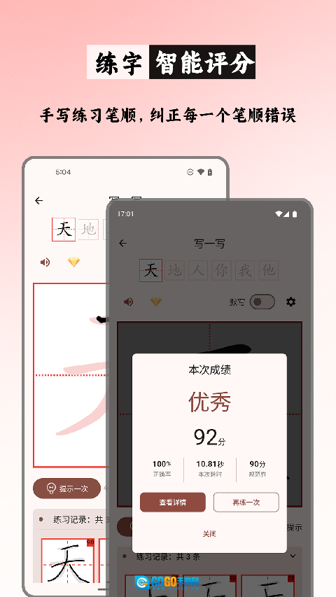 智能书写精准评估:借助实时捕捉笔迹轨迹的功能,手写练习时的每一笔都能被智能评分系统细致分析并给出反馈,还能通过回放书写过程来帮助优化书写技巧。