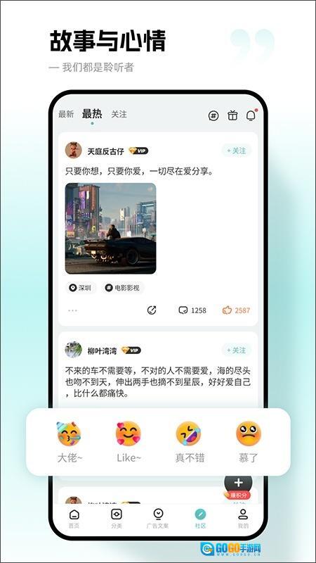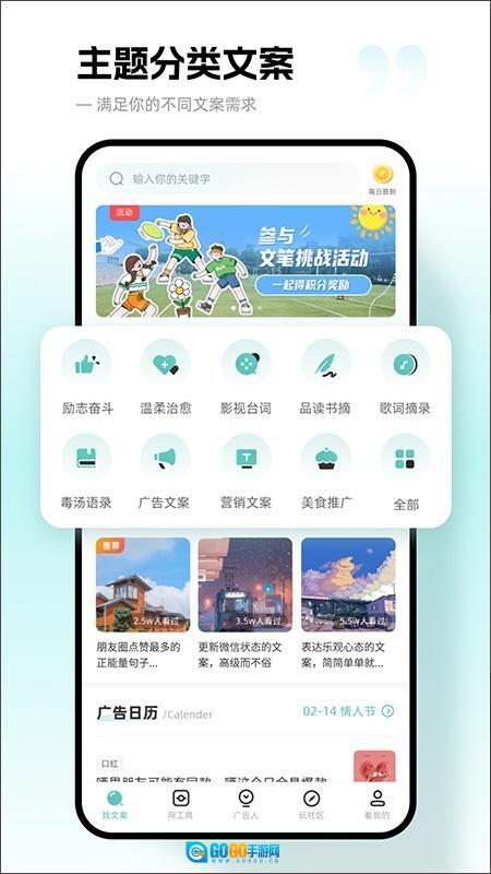 1、海量文案都被规整分类,查找起来更便捷,像恋爱、伤感、青春这类主题都清晰归类