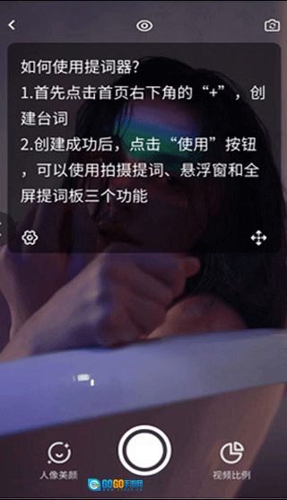 3、开启拍摄提词的Ai智能语音功能,就能体验台词随语速同步呈现;此外还有美颜效果可自动调节美白与磨皮程度,以及视频比例设置(如横竖屏切换等)。