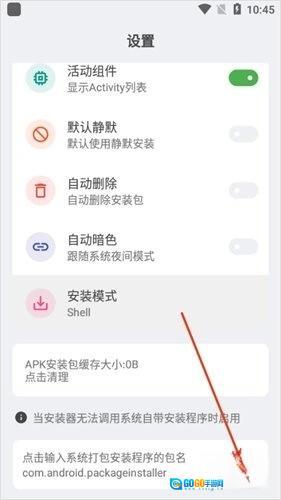 7、如果还无法系统自带的安装程序时,可以启动该设置,输入apk的包名进行安装。