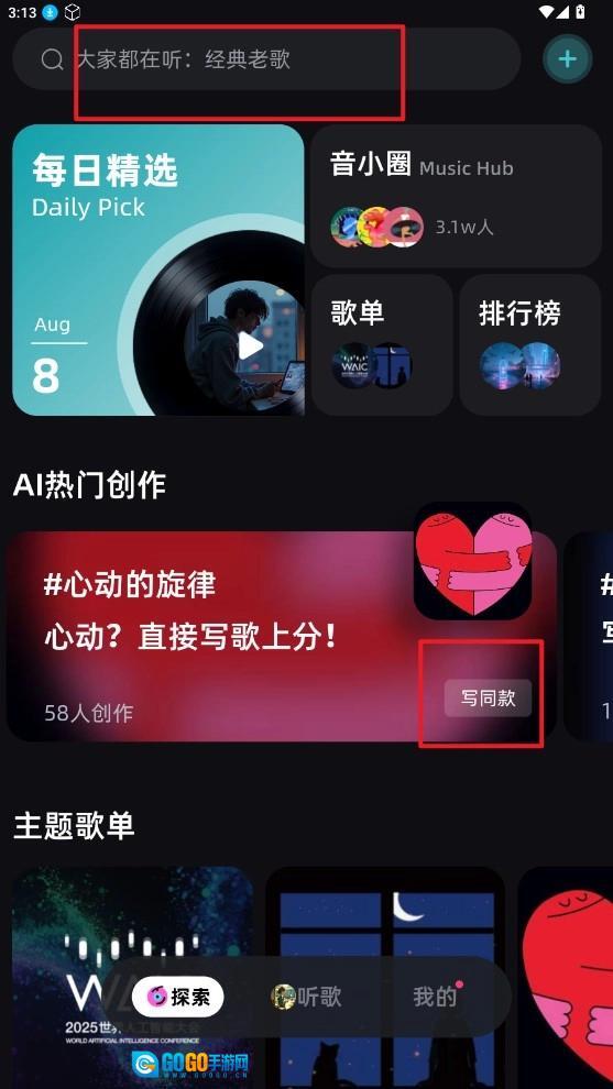 3、如图所示,你可以按照分类查找,也能直接搜索自己喜欢的歌曲,此外还能借助AI来创作歌曲。