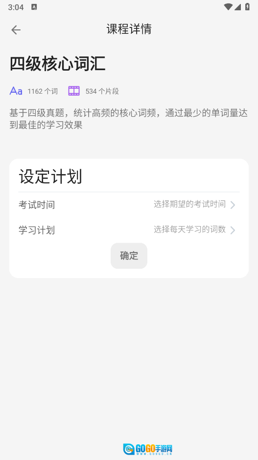 例如小编所选的“四级核心词汇”,点击进入后,能够设置考试时间和学习计划之类的内容。