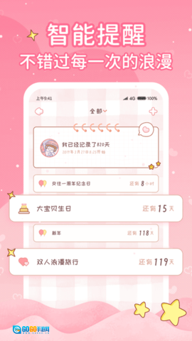 恋爱日记是一款专门为情侣设计的恋爱记录应用。用户可以在软件中记录自己与伴侣之间发生的故事以及每天遇到的趣事。该软件支持每日打卡功能,当打卡累计到一定天数时,用户还能获得相应奖励。它致力于帮助每对情侣巩固并加深彼此的感情。恋爱日记是当下备受欢迎的情侣养成、恋爱记录、甜蜜互动与爱情守护类软件,适用于恋人、情侣、夫妻、异地恋等各类伴侣群体。软件情侣秀、爱情记录、恋爱日记、位置共享、纪念日、愿望清单等丰富功能,旨在打造专属于情侣二人的私密空间——恋爱记事。