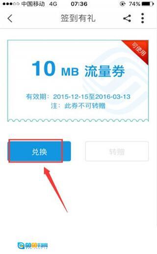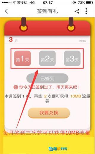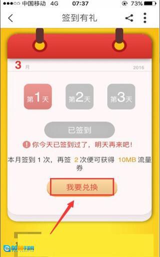 当我们在一个月内成功完成三次签到后,就能免费获取10MB的流量兑换券。之后,依旧在“签到有礼”页面,我们可以点击“我要兑换”按钮来进行流量兑换操作。