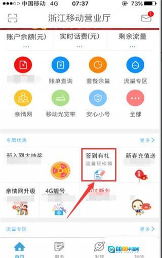 首先在浙江移动手机营业厅APP的首页,我们点击“签到有礼”按钮。