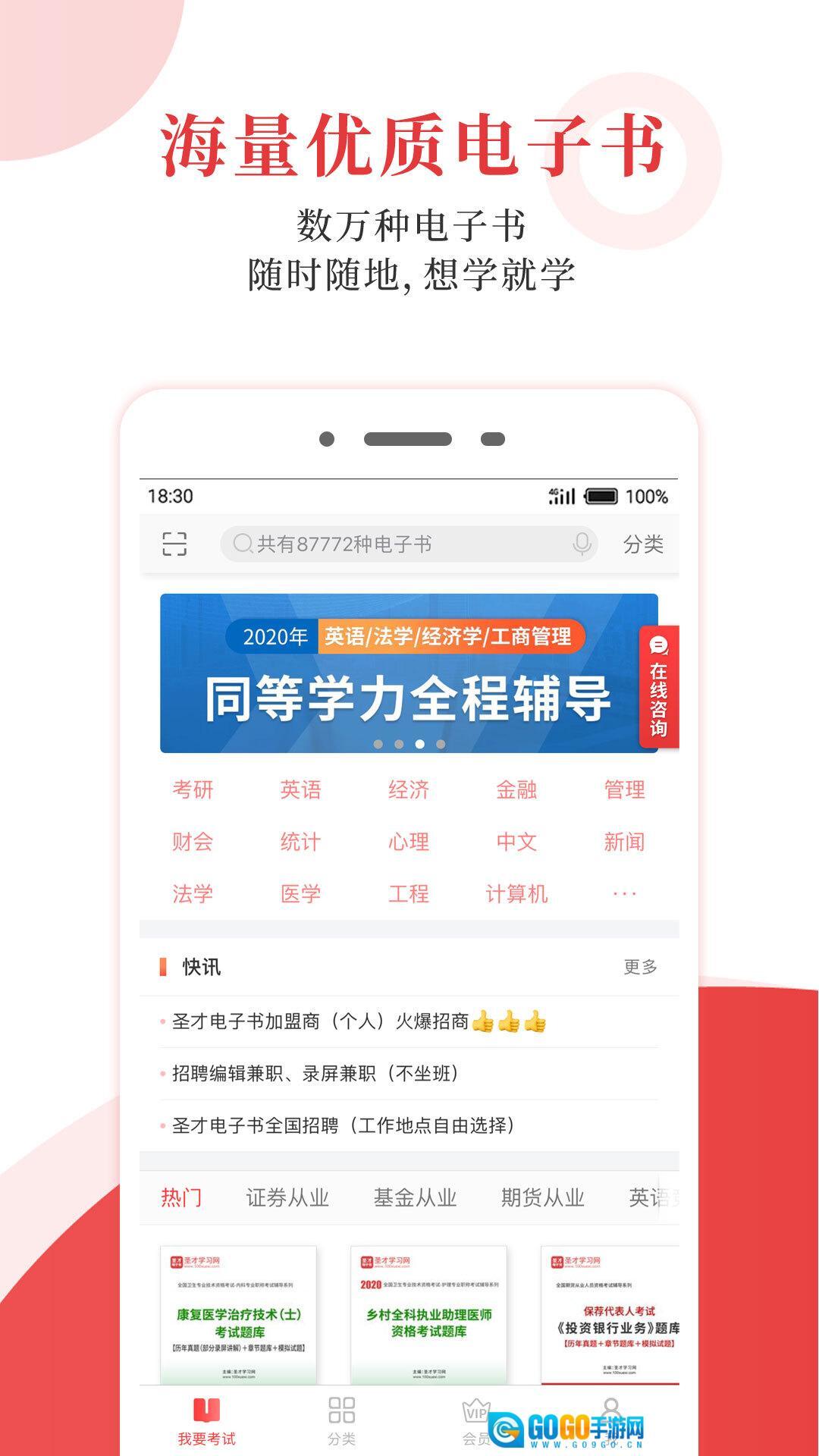 圣才电子书为考生提供全方位的学习资源与支持,覆盖了985/211等500余所高校的考试科目,以及200多种职业资格考试的备考内容。考生可在软件内找到各类考试对应的辅导电子书、视频、题库与直播课程,助力他们更深入地理解和掌握知识点。借助历年真题、模拟考试、错题重做及强化训练等功能,软件能够帮助考生在备考过程中全面巩固重点知识,有效提升考试通过率。