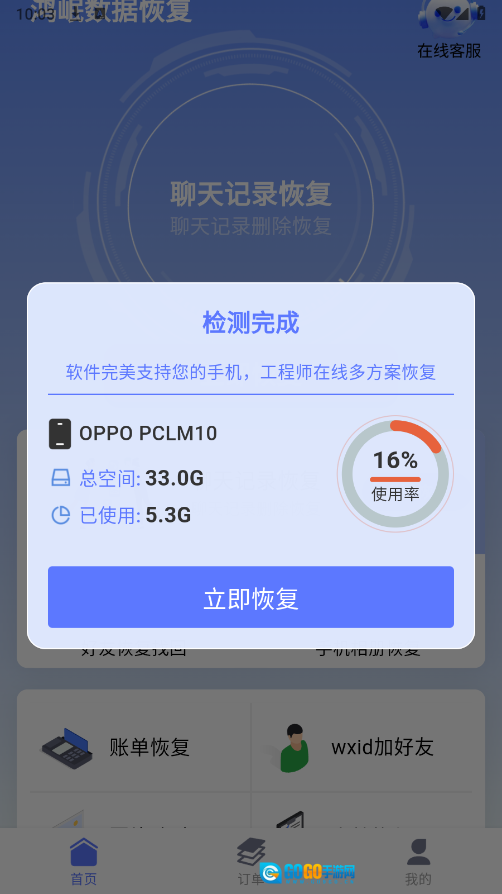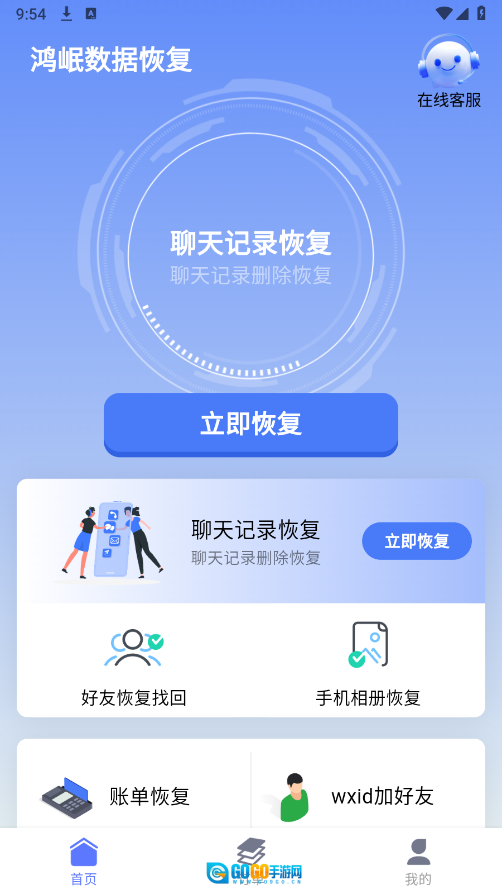 进入首页后,能看到不少数据恢复相关的板块,像相册恢复、好友恢复以及账单恢复等功能都包含在内。