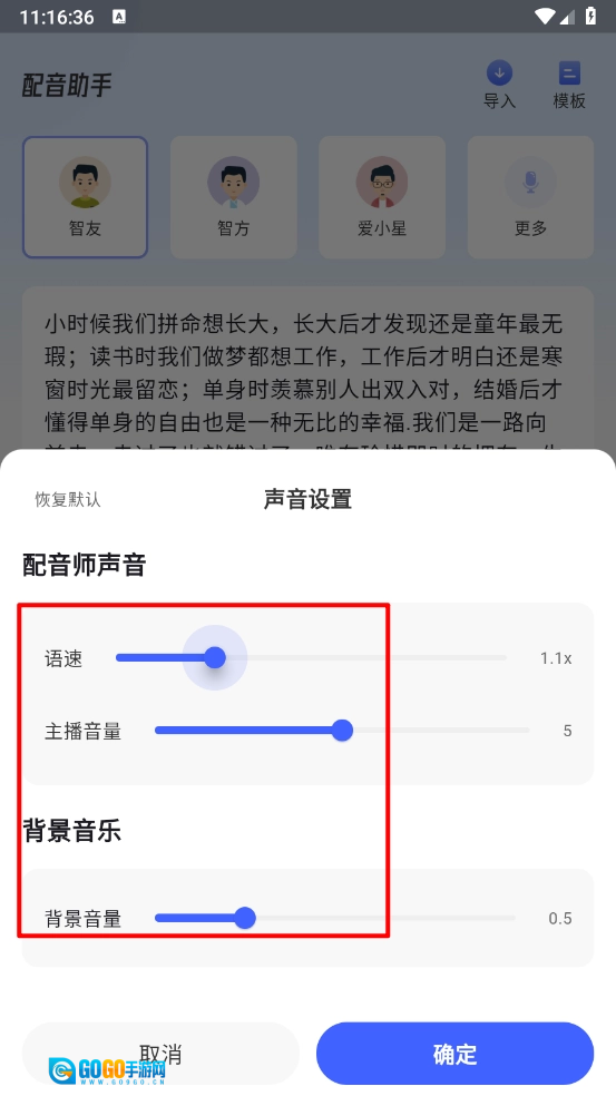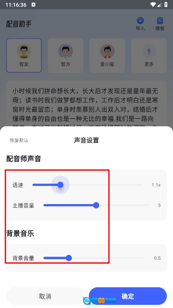 3、接着进入声音设置界面,选择语速、主播音量和背景音量的参数,之后点击“确定”按钮。