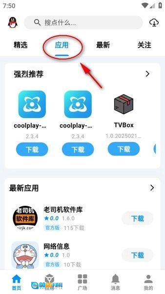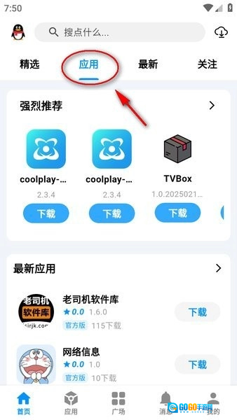 在软件主页,点击最上面的“应用”,进入应用专区。
