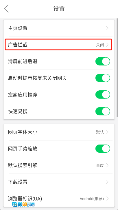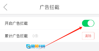 打开“开启广告拦截”右侧的开关,即可启用广告过滤功能。