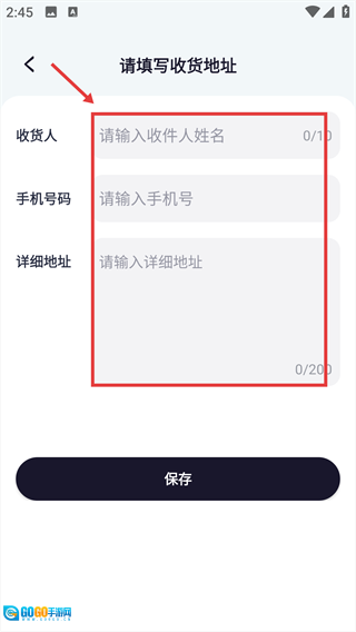 在输入框中填写【收货人】、【手机号码】、【详细地址】等相关信息,填写完成后即可保存该地址。