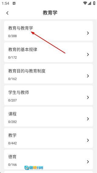 在教育学章节列表页面中,点击目标选项,即可进入该小节对应的答题页面。
