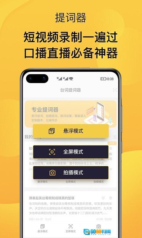 【悬浮题词】各类应用均兼容悬浮窗提示功能,让题词体验更智能化。悬浮窗可悬浮于任意应用界面之上,用户在拍摄或直播过程中无需反复切换页面,提词内容就能保持清晰显示。不管是制作短视频,还是开展长时间直播,悬浮窗都能稳定提供提词辅助,助力用户全身心投入内容创作。