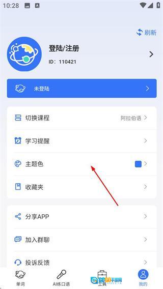 在个人中心页面,点击主题色选项,即可进入主题色设置页面。