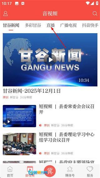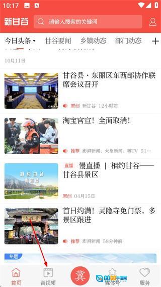 在新甘谷首页,点击底部的音视频选项,即可进入音视频页面。