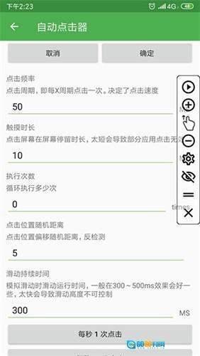 可以对手机点击频率进行实时设置,还能调整手指按下时间、手指弹起时间(通常无需设置)等参数。