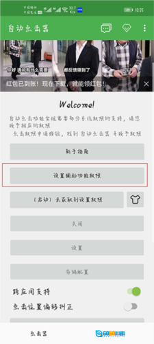 点击“设置辅助功能权限”选项,然后在设置页面里启动“自动电击器”的模拟点击功能。