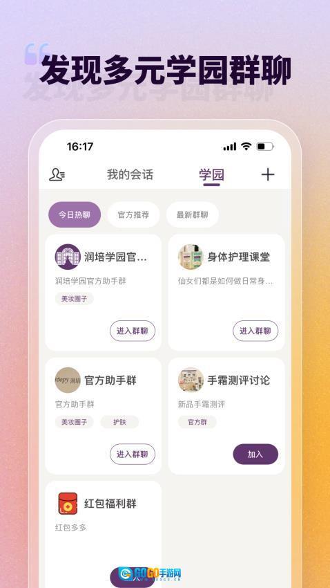 润培学园安卓版是一款专为润培女孩打造的应用,涵盖身体护理、护手霜、护发产品等丰富品类的优质好物。用户可随时在线挑选心仪商品,轻松购入各类心动好物,十分便捷。软件还配备了多样便捷功能,助力用户更高效、顺畅地完成选购流程,全方位提升购物体验。此外,平台设有多元化的学员群聊板块,用户能根据兴趣选择加入相应群聊,参与多人线上互动、生活分享等活动,在交流中发掘更多心仪好物。有需要的用户不妨即刻在本站体验一番!