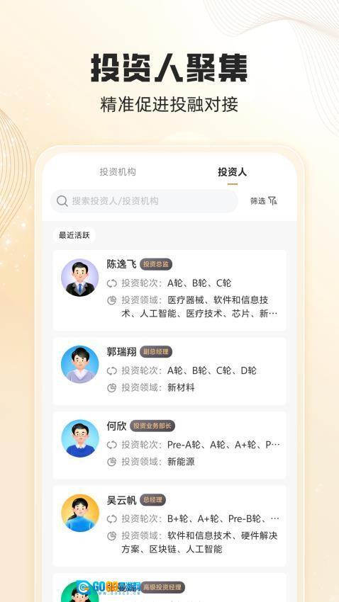 展示了最近活跃的投资者,用户可以在线查找需要的投资人。