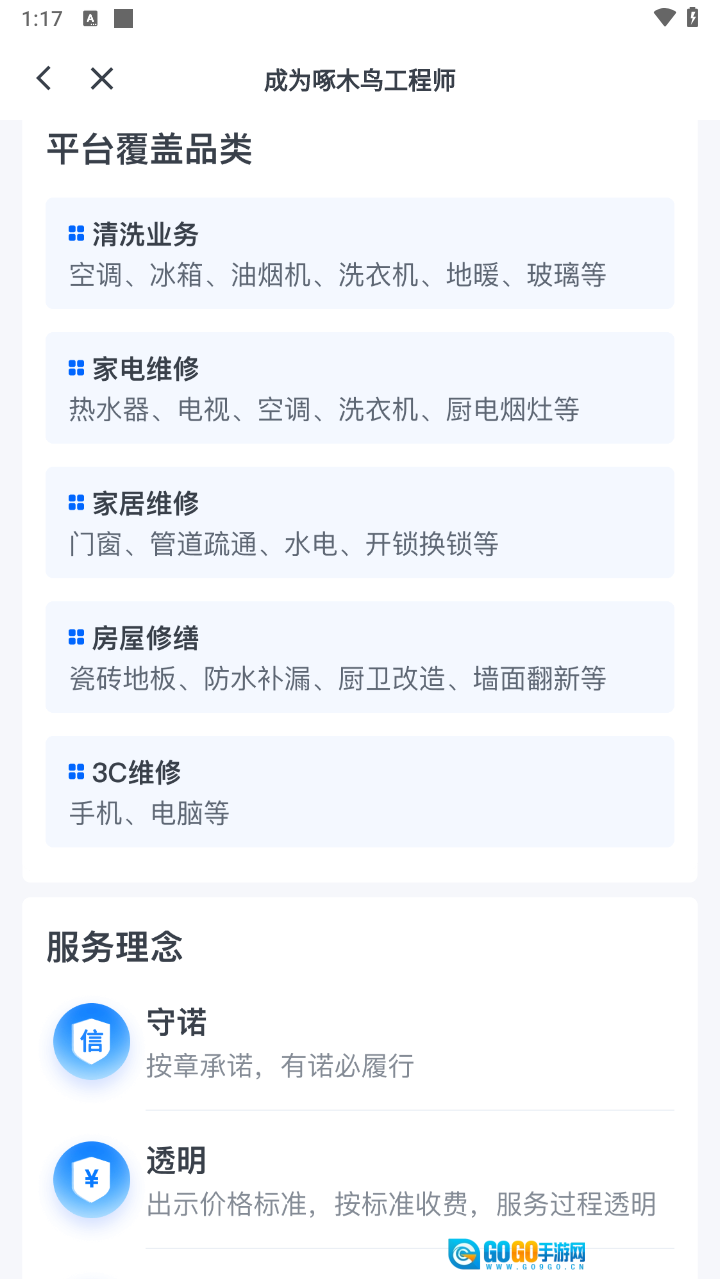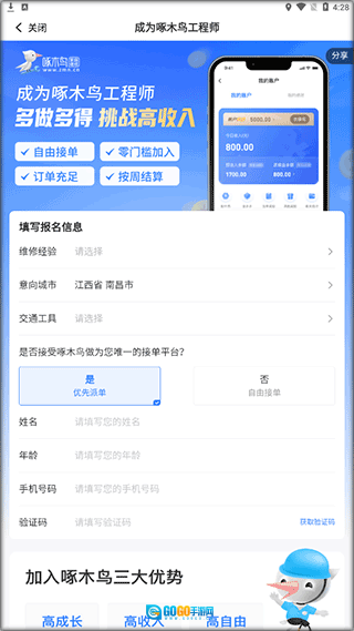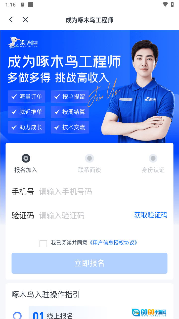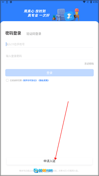 完成啄木鸟工程师的安装后,打开该应用程序,找到界面上对应的入口并点击,即可提交入驻申请。