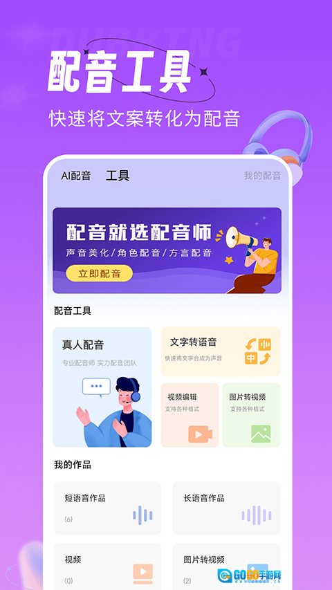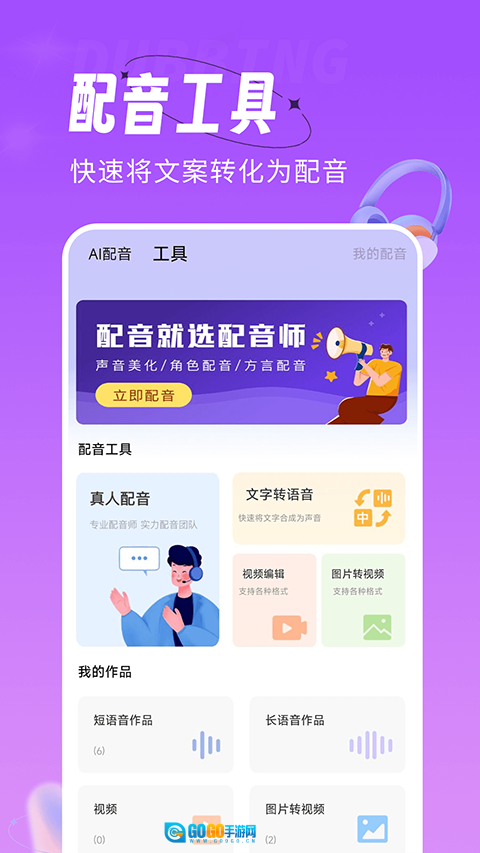 配音师是一款操作简便、使用灵活的专业手机配音应用。它能把海量的声音样本模板与高品质的背景音效库巧妙融合,如同专业的高端音频设备一般,为用户精心制作出优质动听的声音作品。