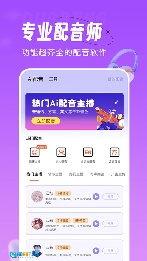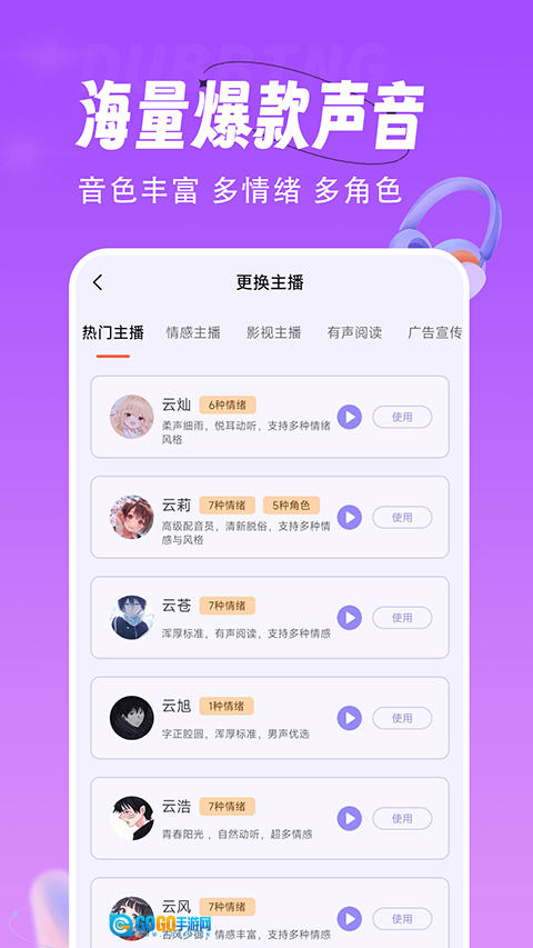 适用于街头贩卖、音频朗读、彩铃制作、儿童配音、广告配音、图文配音、视频剪辑等场景,助您获取更多相关资讯,离配音大师的目标更近一步。借助声优软件,用户能够快速找到心仪的声优类型