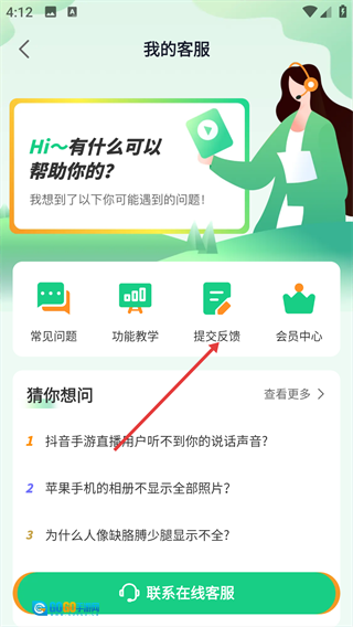 你可以在我的客服页面找到【提交反馈】选项,点击它就能进入问题反馈页面。