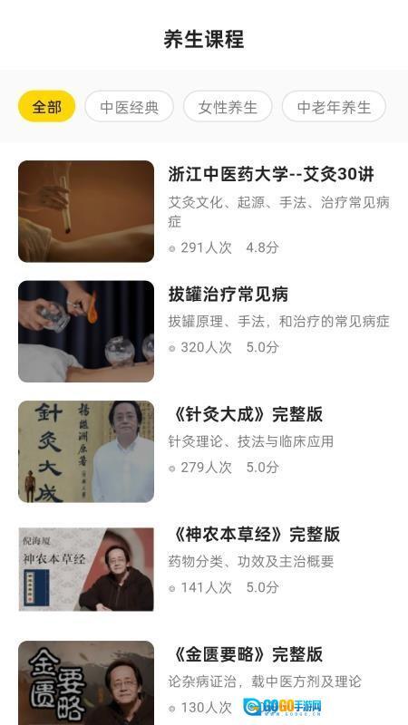 养生功法内容标注播放人次与评分,直观呈现内容的关注度和评价情况,助力用户挑选适宜的养生学习内容。