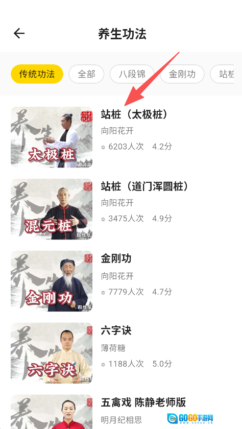 在养生功法页面,选择具体的养生内容。