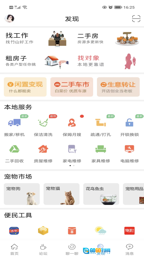 板块分类清晰明了,资讯、求职招聘、房屋租售等内容有序排布,能让用户快速找到所需的本地各类服务信息。