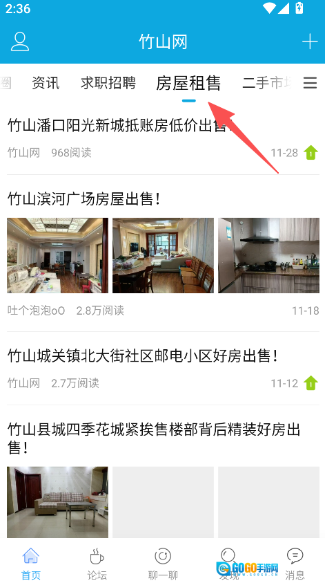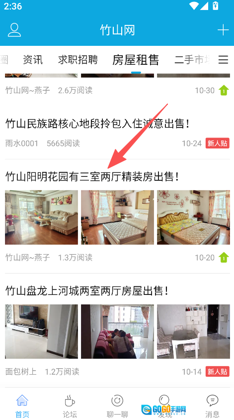 在房屋租售板块中,点击目标房源内容。