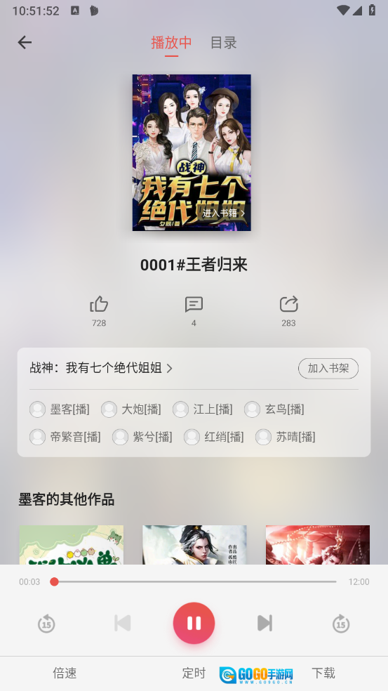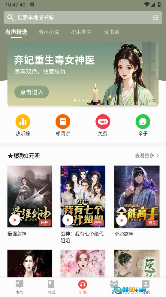 进入听书板块就能开启听书体验,还可以设置播放倍数和定时听书功能。