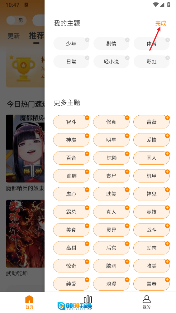 按照图中的指引,挑选你喜爱的漫画主题进入,最后点击“完成”按钮就可以了。