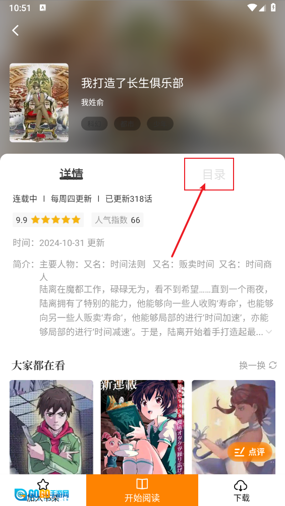 在漫画阅读详情页,点击"目录"即可进行查看。