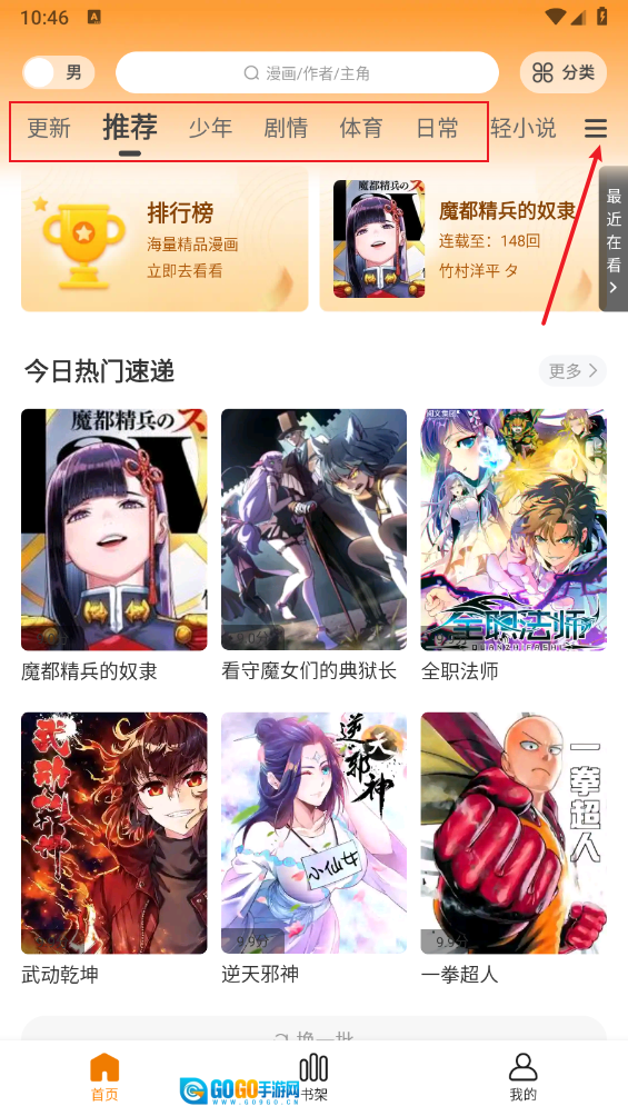 进入首页后,可依据顶部的题材分类查找自己喜爱的漫画,点击右上角的三条横线图标即可进入相关页面。