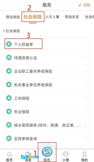 二、登录后,点击“服务”选项,选择“社会保险”,再点击“个人权益单”