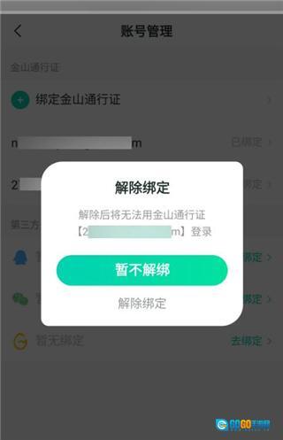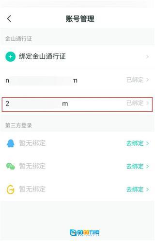 进入账号管理页面后,会显示金山通行证的相关列表,列表最上方是用于绑定金山通行证的链接,其下方则是具体的账号列表,此时只需找到想要解绑的账号并点击即可。