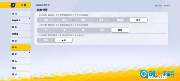 进入系统设置界面,找到画面相关的配置项,将战场场景的显示效果以及帧率等参数都调整到最高级别。